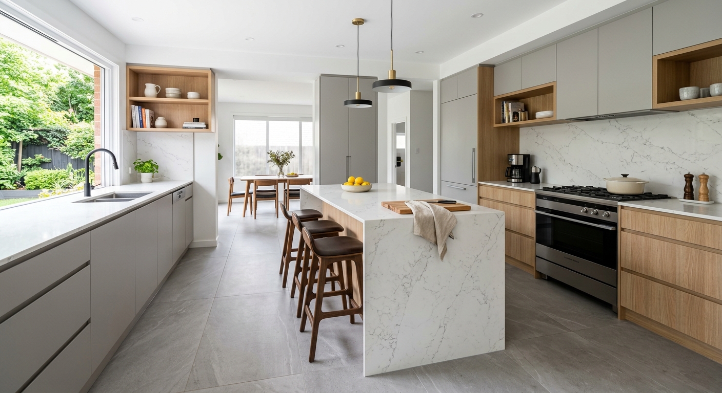 Pose de céramique grand format pour cuisine, salle de bain et entrée.