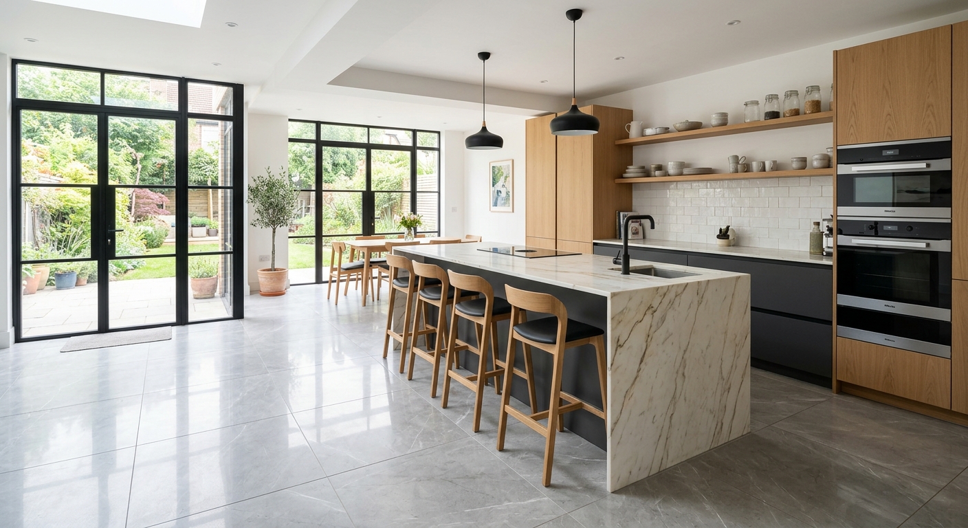 Pose de céramique grand format pour cuisine, salle de bain et entrée.
